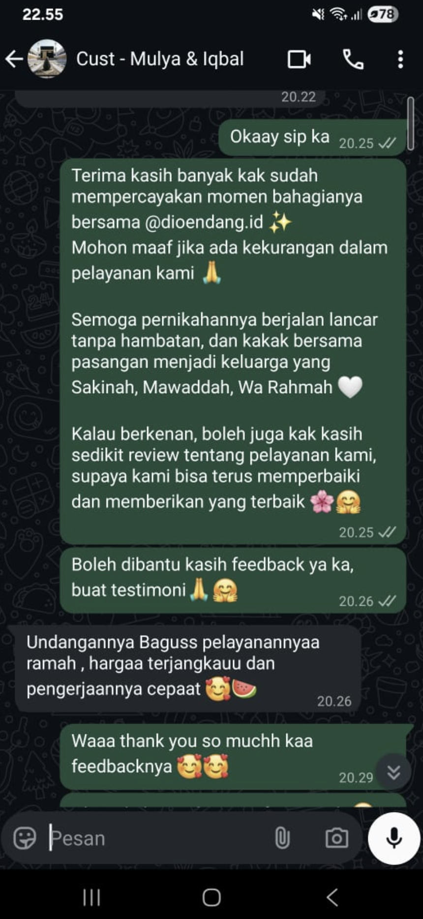 Dari impian hingga kenyataan, Dioendang.id hadir sejak 2021 untuk menemani momen spesialmu. Kami percaya bahwa setiap undangan punya cerita, dan kami siap bantu kamu menyampaikannya dengan cara yang paling berkesan.